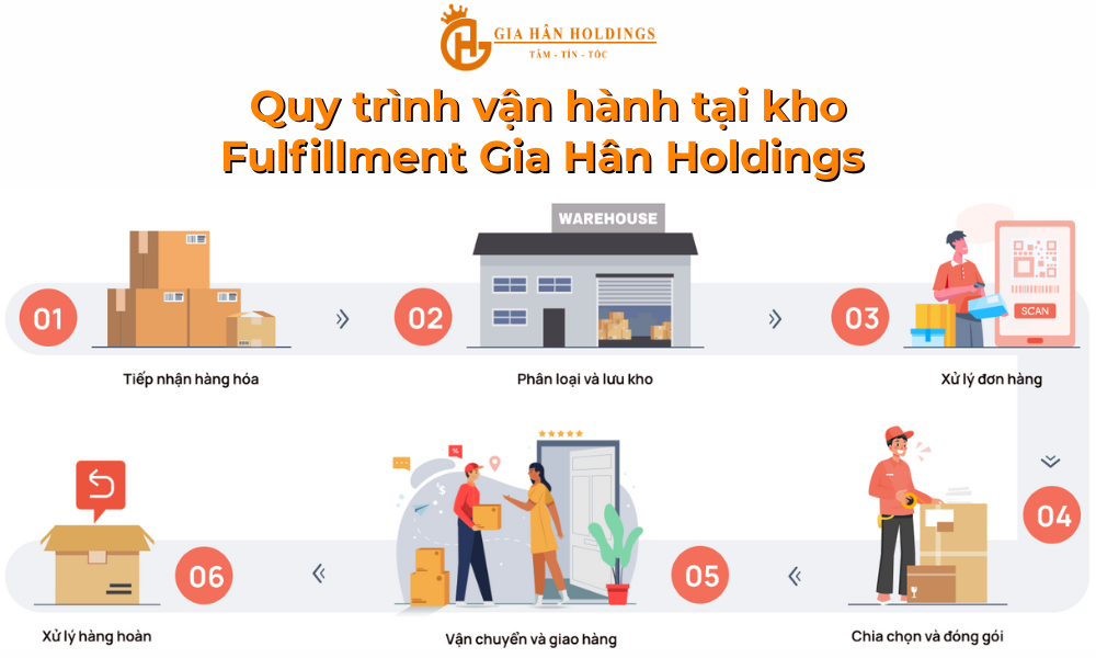 Các bước trong quy trình vận hành kho Fulfillment tại Gia Hân Holdings bao gồm 6 bước: